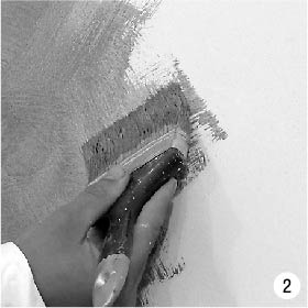 Před aplikací promíchejte vybranou základní směs, postupně přidávejte pigment, dokud nedosáhnete požadovaného odstínu. Naneste materiál plochým, širokým a zkráceným štětcem volnými pohyby, rovnoměrně rozprostírající křemenné částice po povrchu (obr. 2).