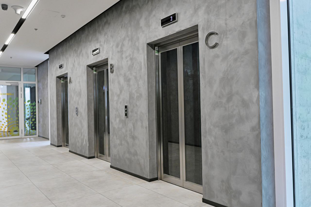 Aplikace dekorativní omítky MARMORINO SATINATO STYLE na chodbách u výtahů a dekorativní omítky CASTELLO FINE na stěnu u vchodu.